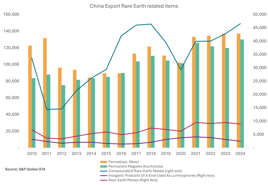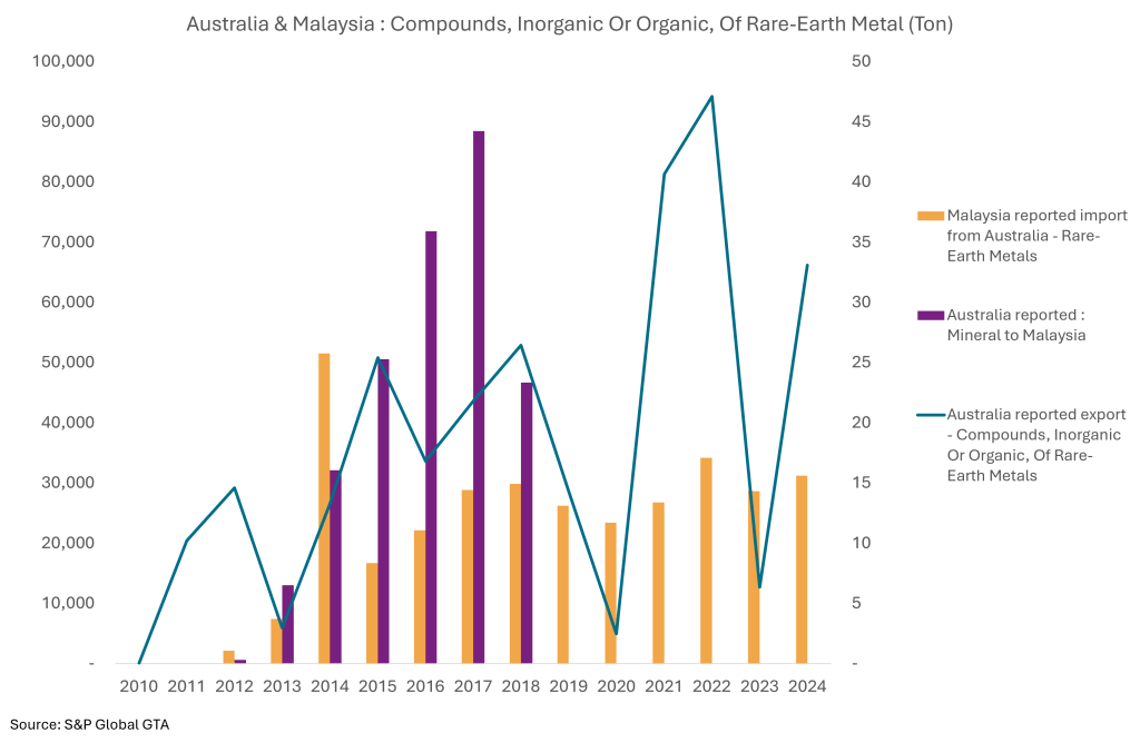 China’s export of rare earth related items are now more featured in compound and down-stream use (although not the end use), compared to decades ago when export is more focused on raw material. Permanent magnet is now one of the key output (and the most frequent subject of export control evasion as captured by China Customs; probably that’s why President Trump called “they have to give us magnets”); while Malaysia – also having its strategy on rare earth up/mid/down stream, has less export raw material since 2021 but yet to ramp up on downstream. Australia features in more resource-intense reflecting in its export (especially since Lynas started production in MA back 2012)- although the produce is more of Lanthanides family. As earlier said it’s not only about where the ore is, but about refining, purity and scalability, and also, the application of them. A modern technology version of “clay to fine bone china”.